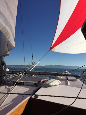 Tide Against us in Racoon Straits until we got halfway through. Wharrams do go to windward, albeit a little slowly!